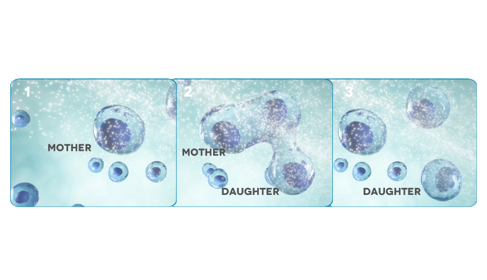3. REPLICACIÓN DE LAS CÉLULAS MADRE: El cambio en el potencial transmembrana de las células madre induce su replicación. La célula madre se regenera de forma asimétrica, creando dos células madre llamadas madre e hija.